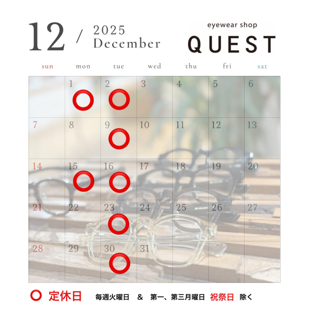 2025年12月定休日のお知らせ。 2025.11.28 未分類 Tweet Share Hatena Pocket RSS feedly Pin it 12月も第一、第三月曜日、あと毎週火曜日が定休日。年末年始は元旦と2日をお休みします。よろしくお願いいたします。 eyewearshop QUEST 伊藤 Tweet Share Hatena Pocket RSS feedly Pin it 投稿者: questaff 未分類 コメント: 0 2025年11月定休日のお知らせ。前の記事