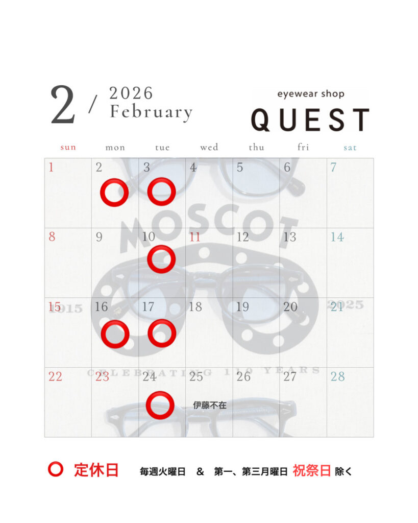 2026年2月定休日のお知らせ。 2026.02.1 未分類 Tweet Share Hatena Pocket RSS feedly Pin it 2月定休日のお知らせです。ご来店いただく前にご確認いただけると幸いです。よろしくお願いいたします。 eyewearshop QUEST 伊藤 Tweet Share Hatena Pocket RSS feedly Pin it 投稿者: questaff 未分類 コメント: 0 2026年1月定休日のお知らせ。前の記事